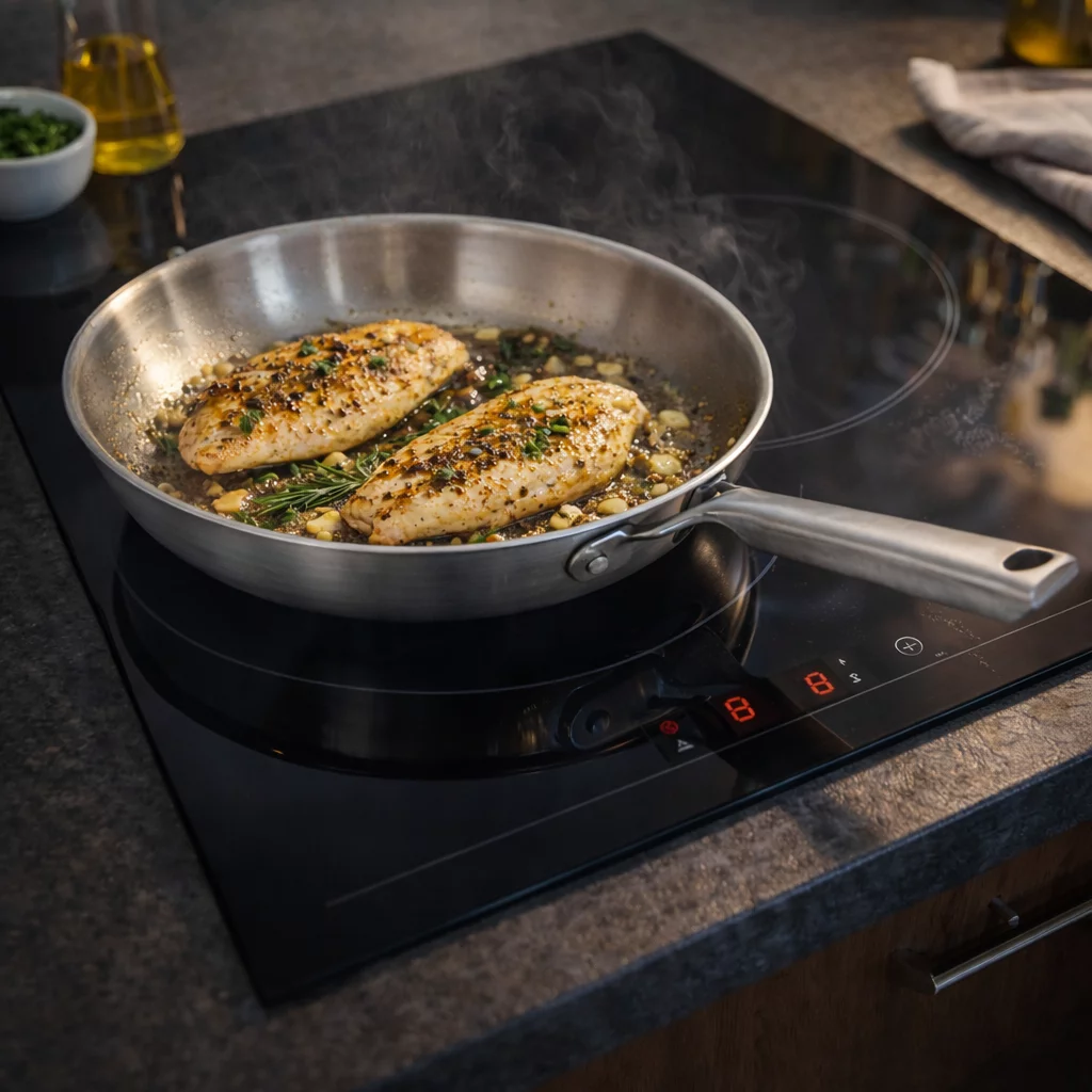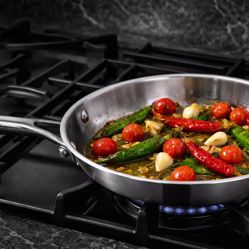 השכבה הפנימית עשויה נירוסטה איכותית המתאימה למגע עם המזון, במרכז שכבת אלומיניום לפיזור חום אופטימלי, ומבחוץ נירוסטה עמידה לכל סוגי הכיריים, כולל אינדוקציה. כל כלי הבישול בטוחים לשימוש עם כלי מתכת. עיצוב אלגנטי בגימור מוברש .