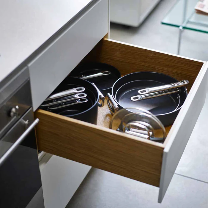 יש לאחסן את הכלים עם מגני מחבתות ולוודא אוורור מספק בזמן השימוש.